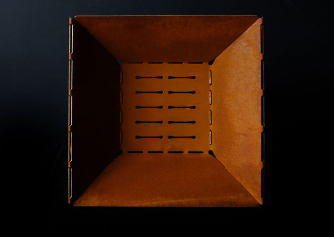 Crafted from a single folded CNC plasma-cut piece of weathering steel, this fire pit design offers optimal flexibility with three sizes for three types of users in mind: the porch hang out, the patio gathering, and the yard party.